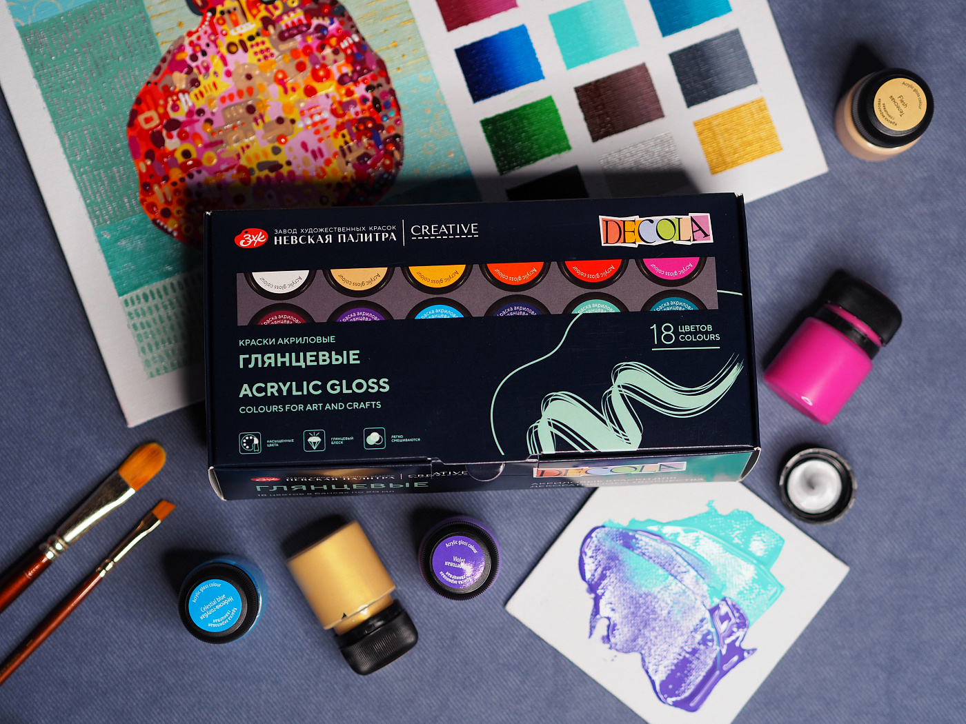 <strong>Набор акриловых красок «DECOLA»</strong> включает 18 баночек по 20 мл воднодисперсных, быстро сохнущих акриловых красок разных цветов. Эти краски можно разбавлять водой, но после высыхания они становятся водостойкими.