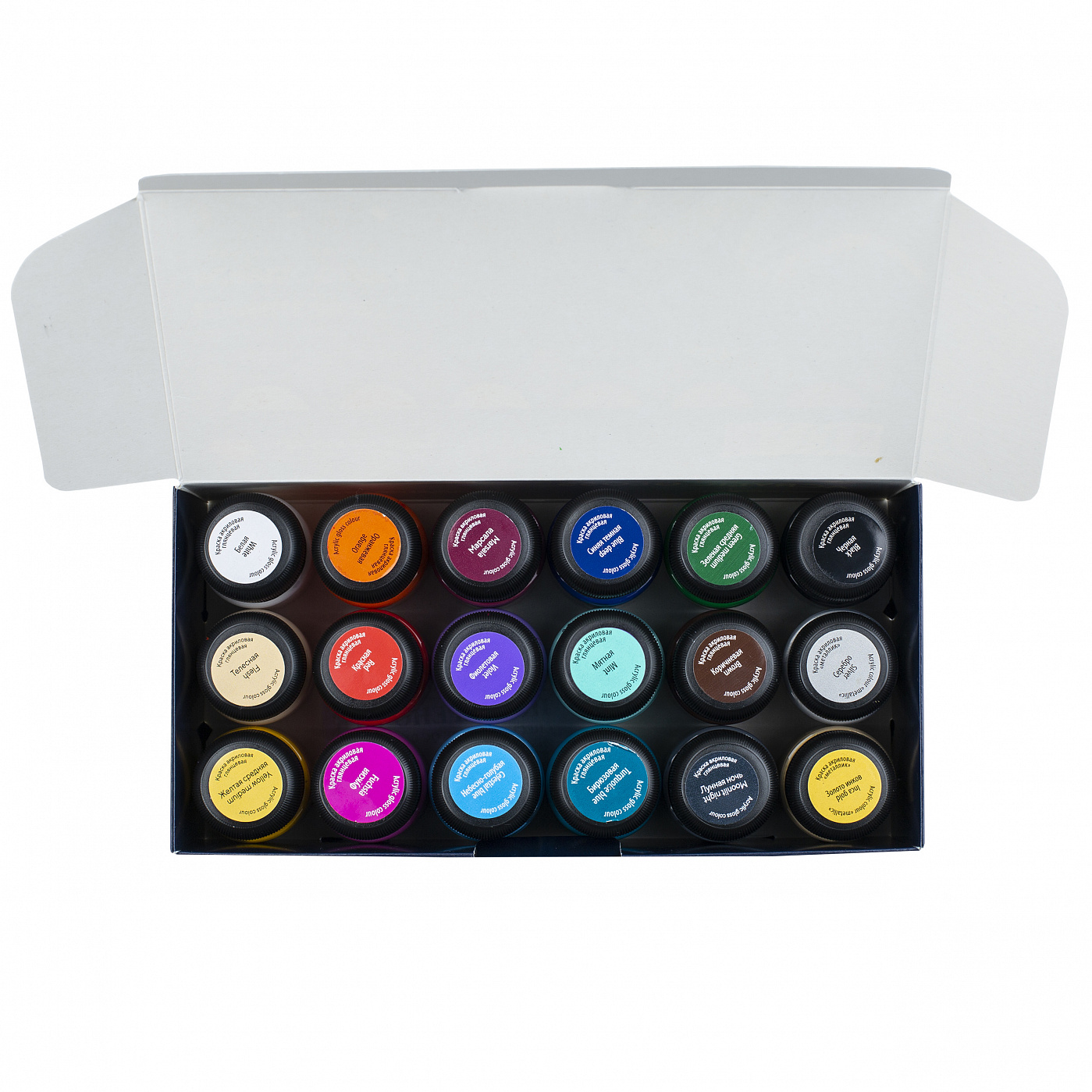 Набор упакован в картонную коробку и содержит 18 баночек глянцевых акриловых красок, упакованных в картонную коробку.