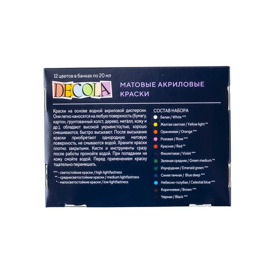 <strong>Набор акриловых красок «DECOLA»</strong> включает 12 баночек по 20 мл воднодисперсных, быстро сохнущих акриловых красок разных цветов. Эти краски можно разбавлять водой, но после высыхания они становятся водостойкими.