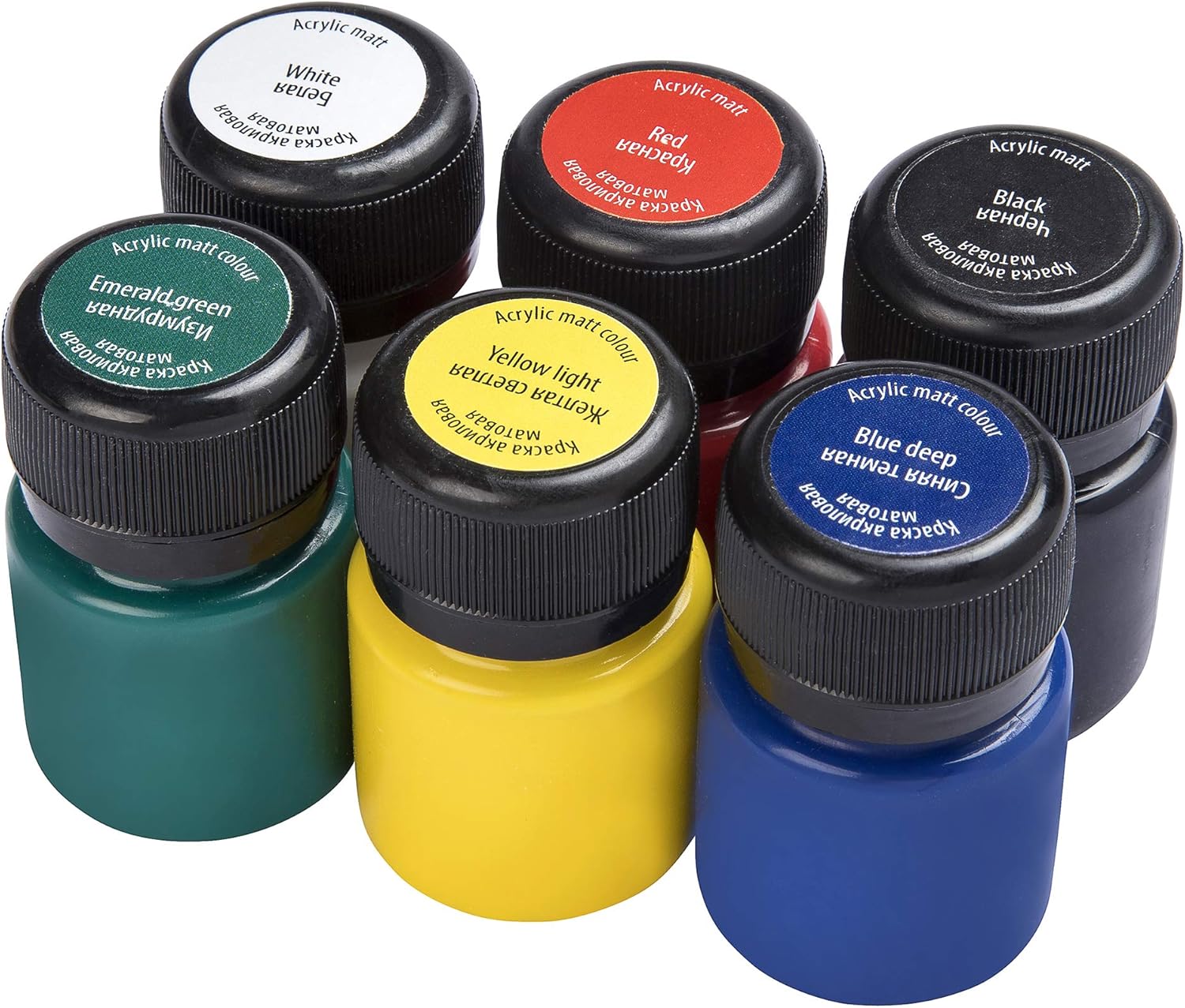 Набор упакован в картонную коробку и содержит 6 баночек матовых акриловых красок, упакованных в картонную коробку.