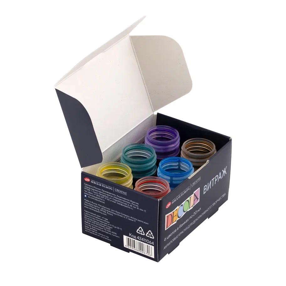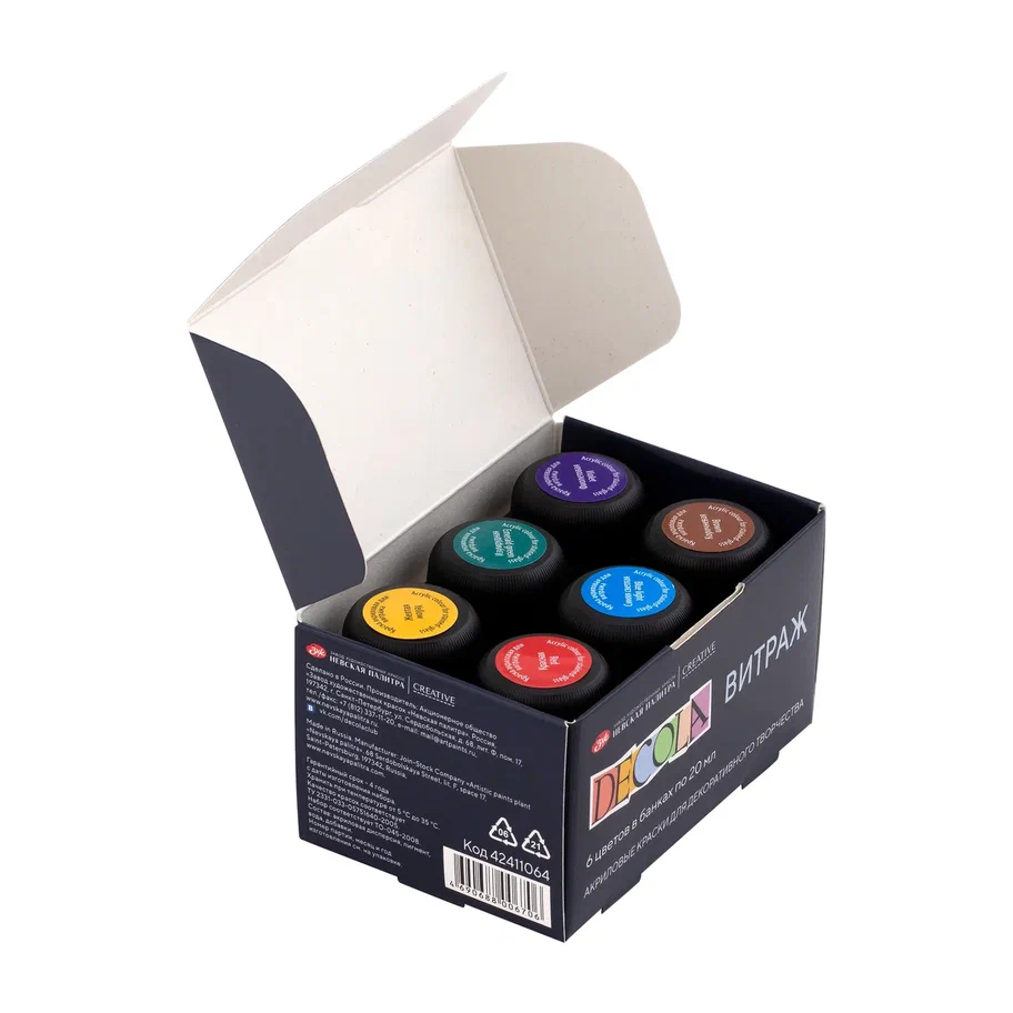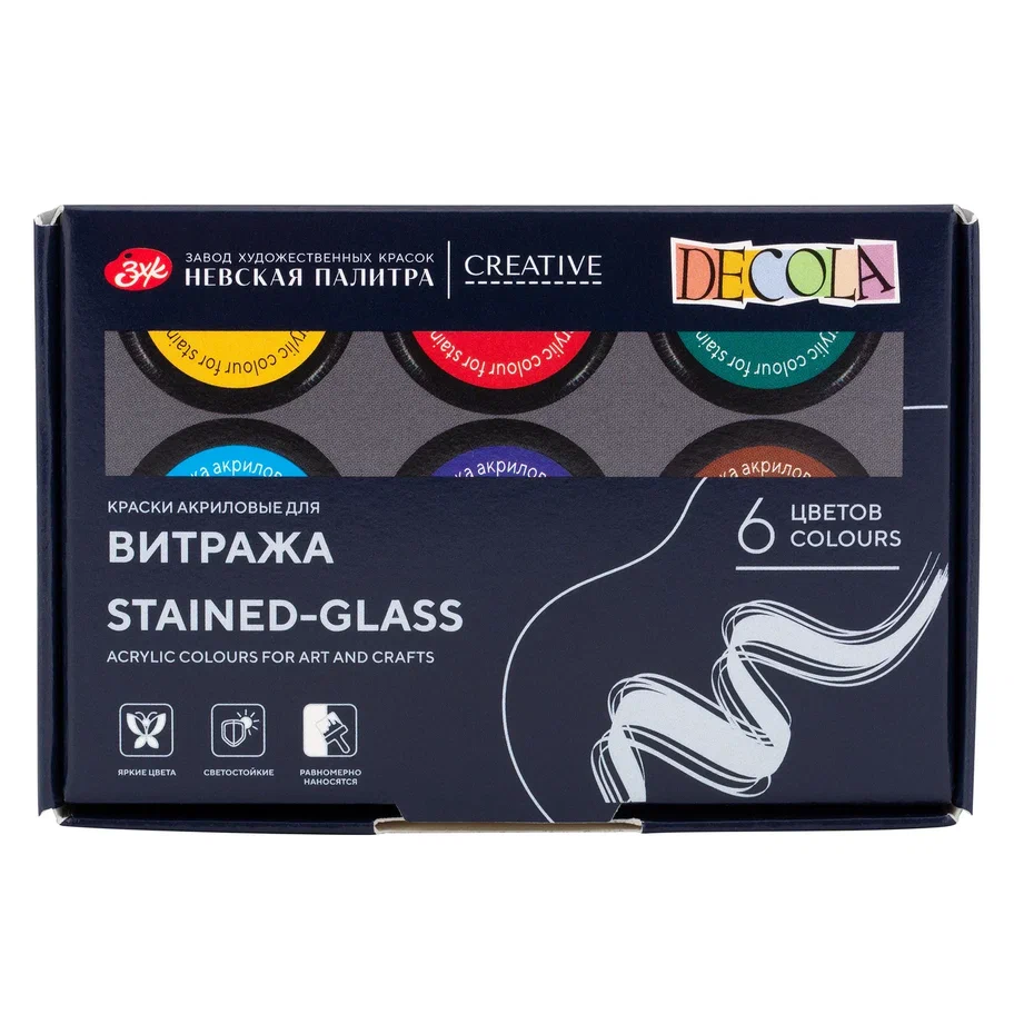 Витражные акриловые краски Decola на водной основе — это идеальный материал для росписи стекла и создания эффекта настоящего витража. Благодаря своей полупрозрачной текстуре, они обеспечивают яркие и насыщенные цвета, которые не тускнеют после высыхания. Эти краски подойдут как для опытных мастеров, так и для тех, кто только начинает работать со стеклом.