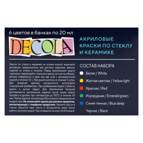 —Набор акриловых красок по стеклу/керамике DECOLA 6 шт х 20 мл, картон NP-4041026