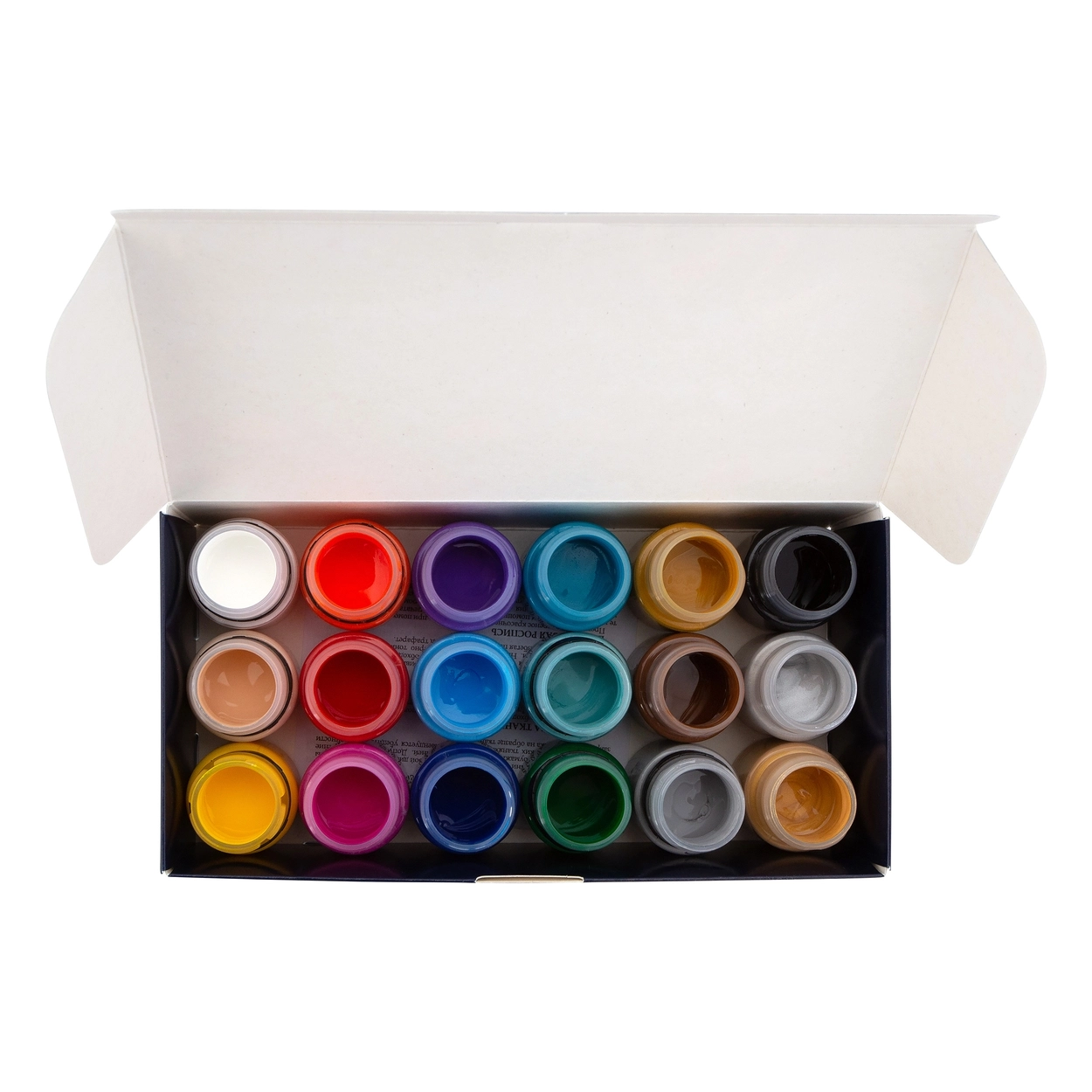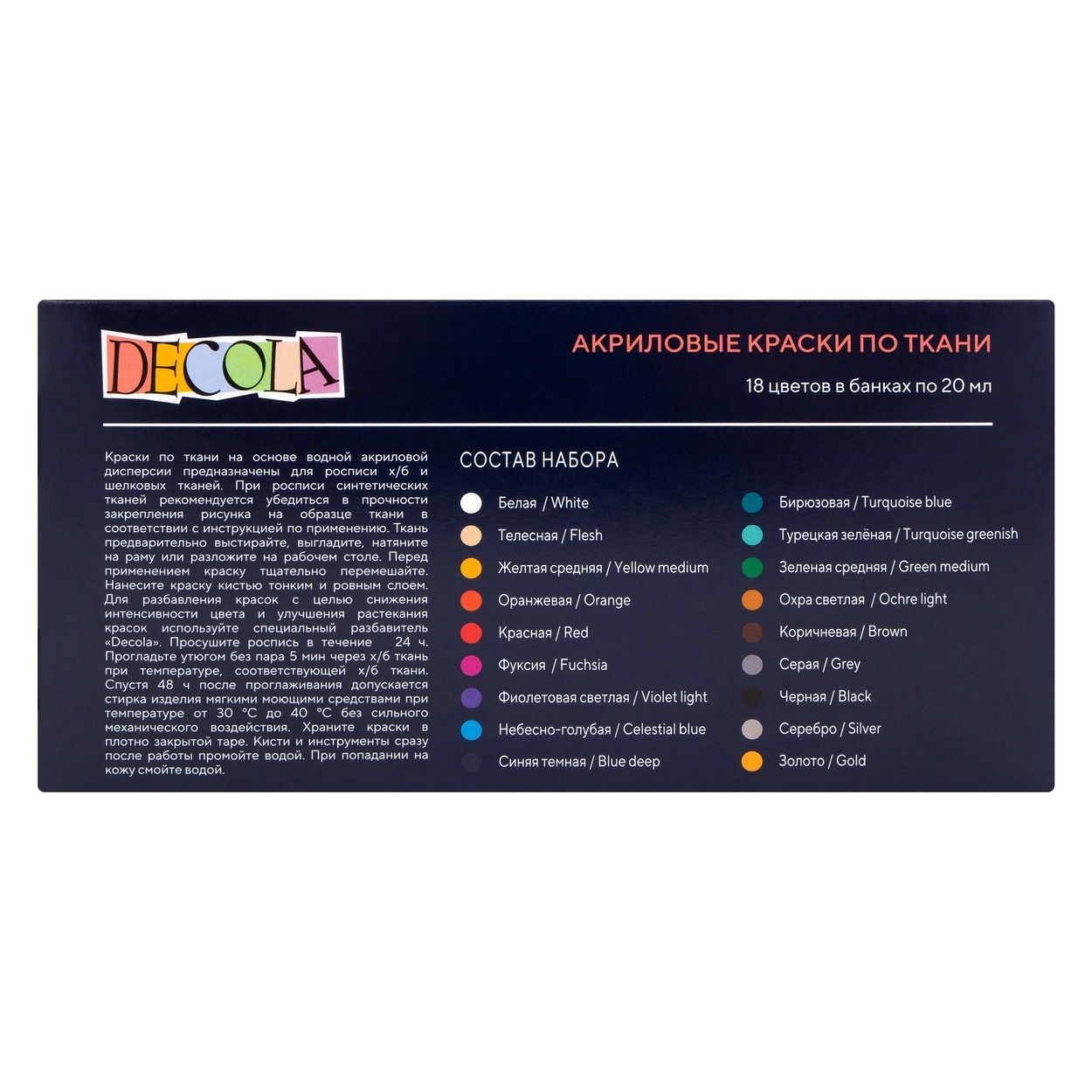 <b>Набор акриловых красок по ткани DECOLA содержит 18 банок по 20 мл</b><br>
