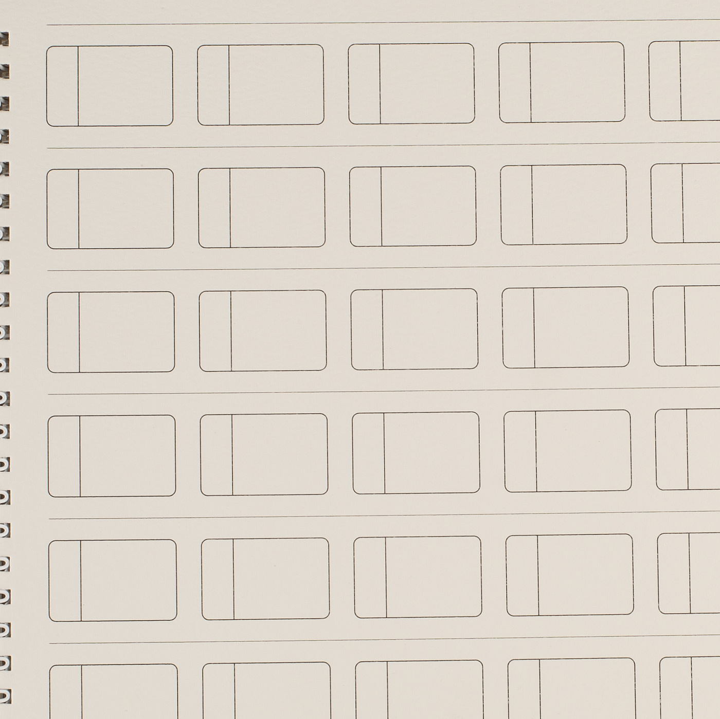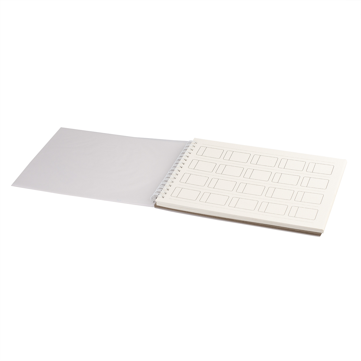 Продуманная структура альбома включает специальные поля для подписи названий каждого оттенка. Нанесенная вертикальная линия в зоне выкраски позволяет наглядно оценить степень укрывистости краски — от прозрачной до плотной. Особое внимание уделено сохранности образцов: каждый лист защищен вставкой из кальки, что предотвращает склеивание страниц и размазывание пигмента. Компактный формат А5 делает альбом удобным для использования на пленэрах и в поездках.