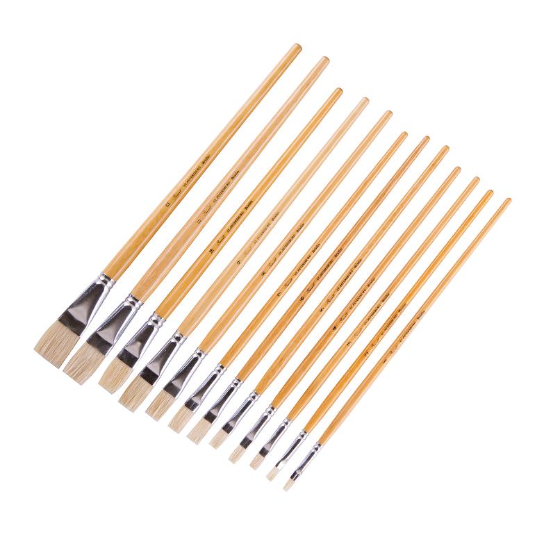 <p>Набор плоских кистей «Сонет» из отборной натуральной щетины разработан для художников, работающих с густыми красками и большими форматами. Благодаря высокой гигроскопичности щетина удерживает значительный объем краски, что позволяет уверенно работать над крупными участками холста, создавать фактурные мазки и ровные заливки фона. Плоская форма пучка идеальна для нанесения четких геометрических линий, широких лессировок и формирования рельефной поверхности в технике импасто.</p>