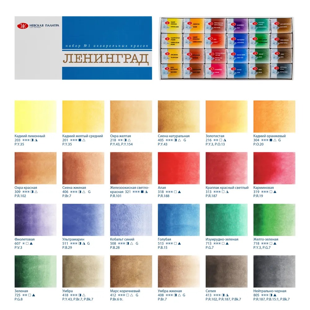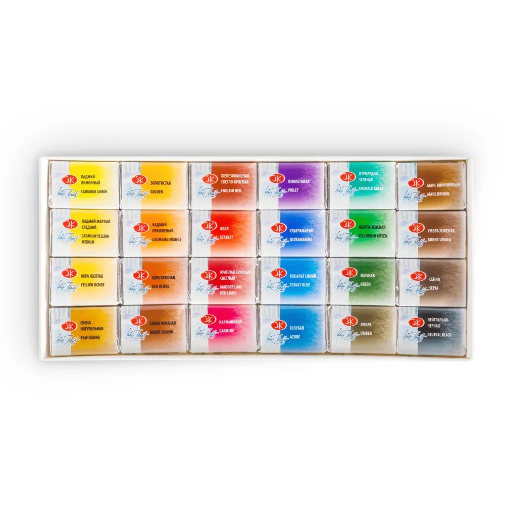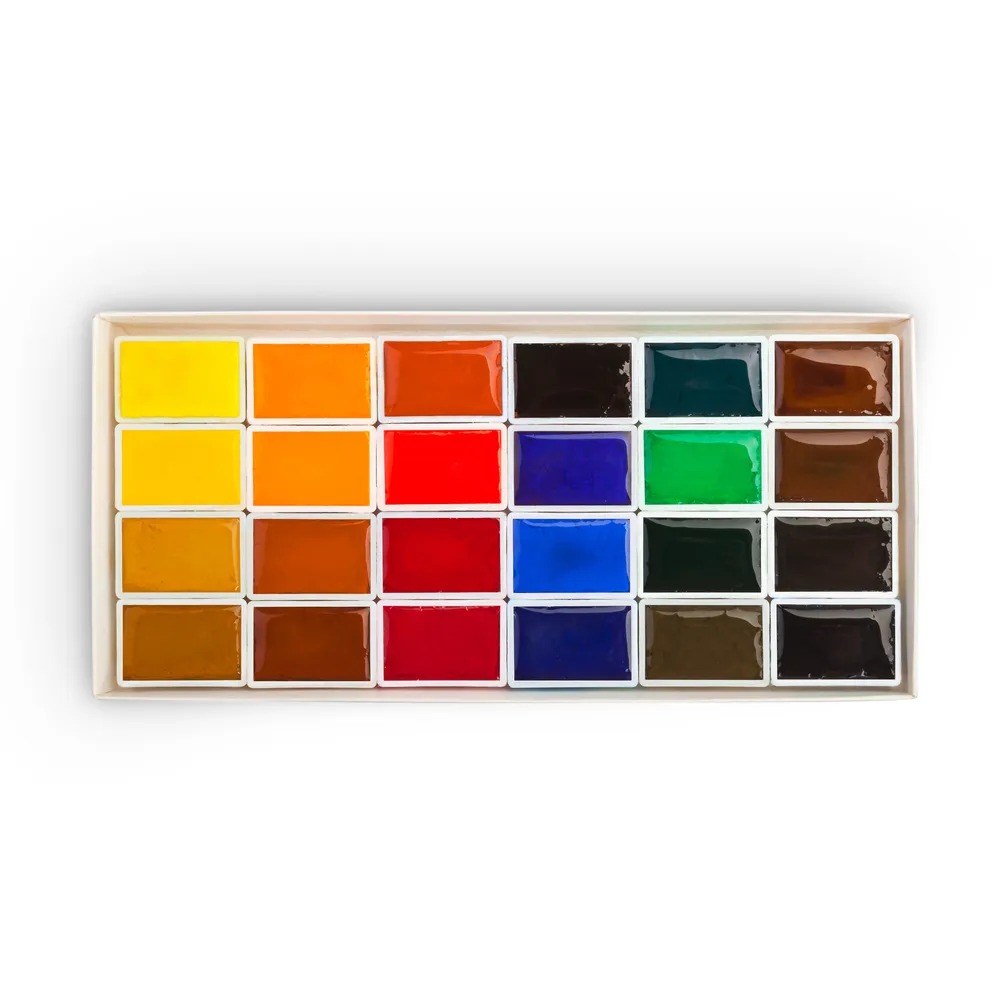 <u>Состав набора</u>: Кадмий лимонный, Кадмий желтый средний, Охра желтая, Сиена натуральная, Золотистая, Кадмий оранжевый, Охра красная, Сиена жженая, Железоокисная светло-Красная, Алая, Краплак красный светлый, Карминовая, Фиолетовая, Ультрамарин, Кобальт синий, Голубая, Изумрудно-зеленая, Желто-зеленая, Зеленая, Умбра, Марс коричневый, Умбра жженая, Сепия, Нейтрально-черная