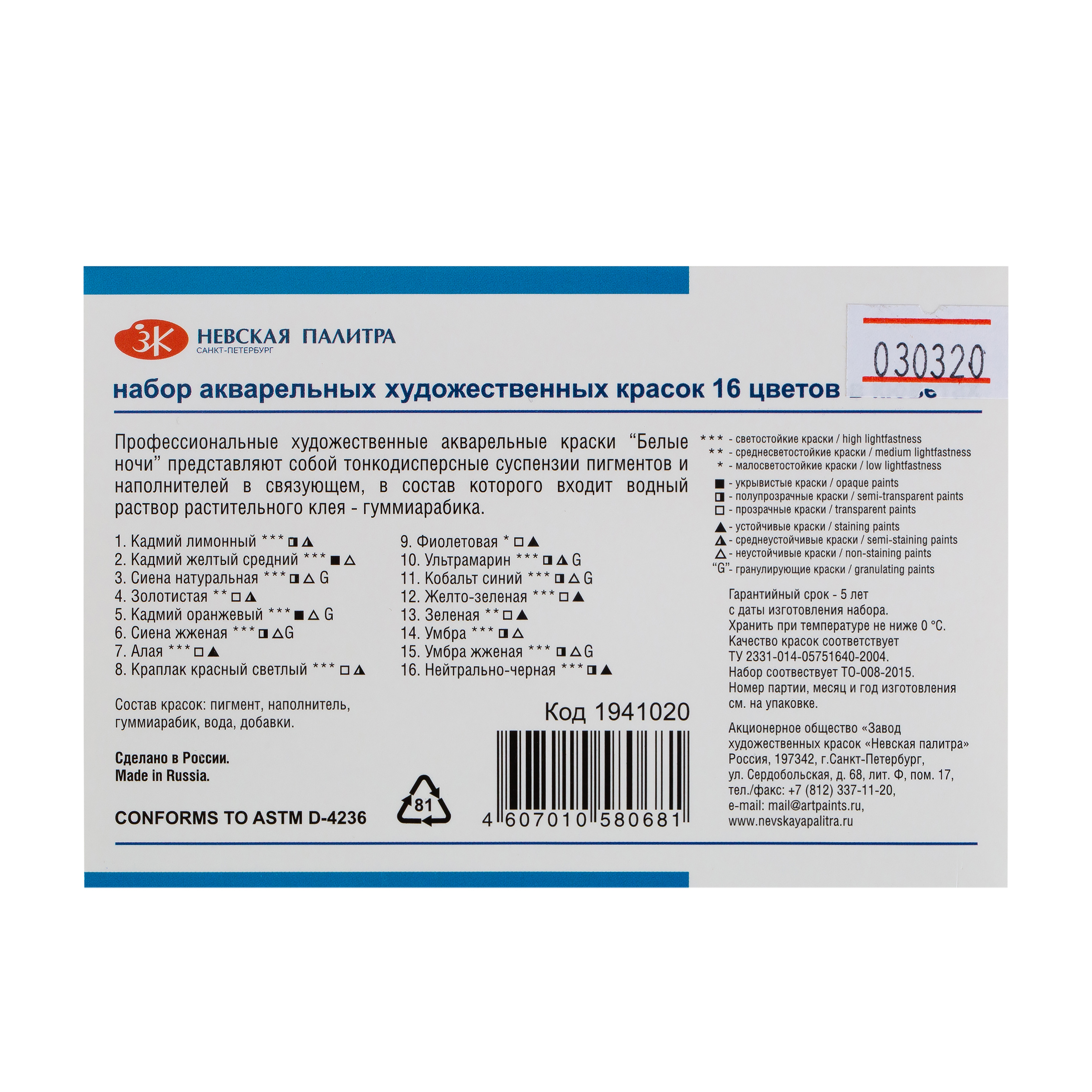 <li>Все акварельные краски в палитре «Белые ночи» безопасны, сертифицированы и соответствуют стандартам ASTM D-4236.</li>