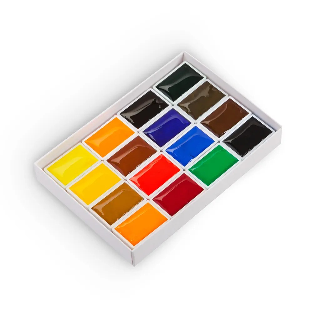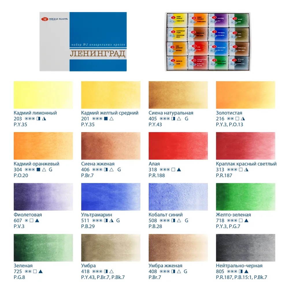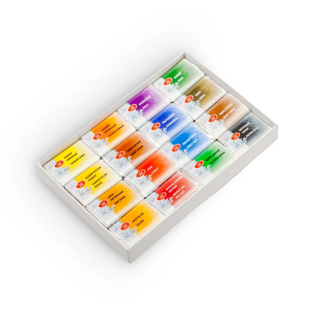 <u>Состав набора</u>: кадмий лимонный, кадмий желтый средний, сиена натуральная, золотистая, кадмий оранжевый, охра красная, алая, карминовая, фиолетовая или фиолетово-розовая, ультрамарин, голубая, желто-зеленая, зеленая, умбра, марс коричневый, нейтрально-черная.