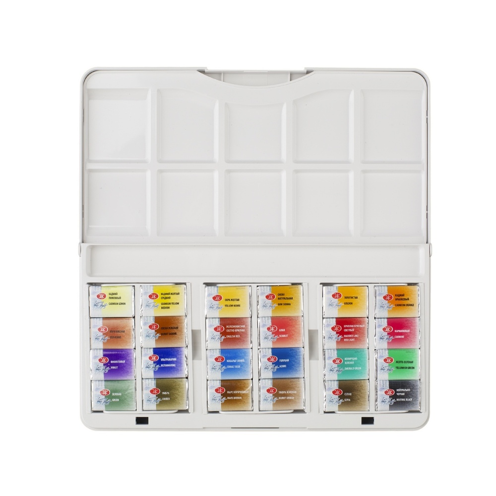 <u>Состав набора</u>: Кадмий лимонный, Кадмий желтый средний, Охра желтая, Сиена натуральная, Золотистая, Кадмий оранжевый, Охра красная, Сиена жженая, Железоокисная светло-красная, Алая, Краплак красный светлый, Карминовая, Фиолетовая, Ультрамарин, Кобальт синий, Голубая, Изумрудно-зеленая, Желто-зеленая, Зеленая, Умбра, Марс коричневый, Умбра жженая, Сепия, Нейтрально-черная