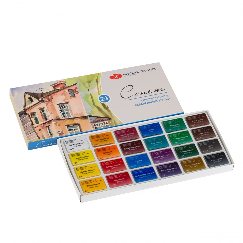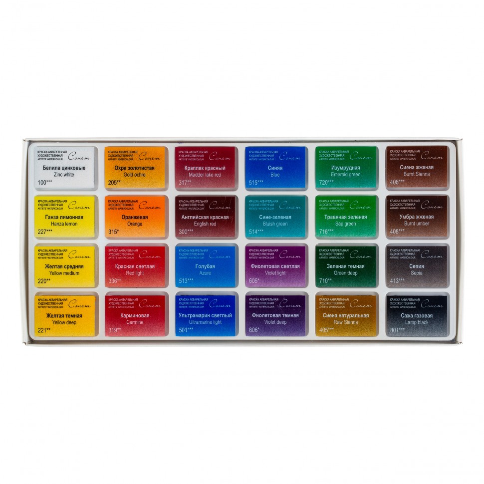 <b>Сбалансированная палитра в наборе акварели «Сонет» состоит из 24 базовых цветов, необходимых начинающему художнику для выполнения учебных работ, этюдов и эскизов.</b><br>