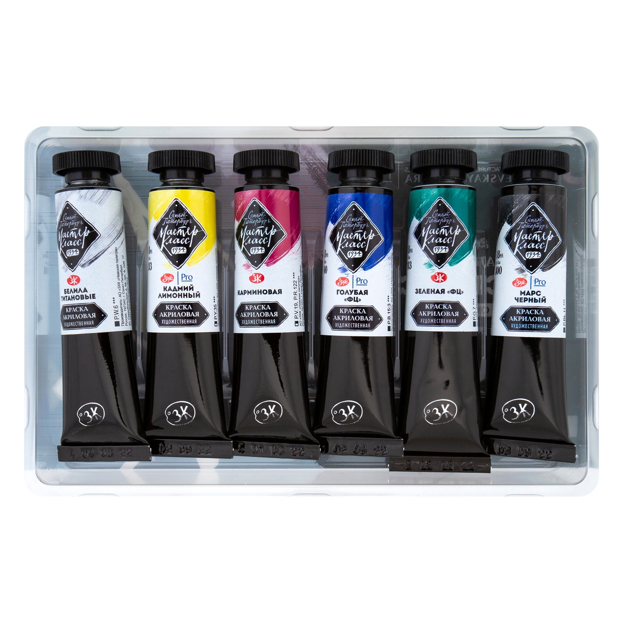 <u>В набор входят следующие цвета</u>: белила титановые, кадмий лимонный, карминовая, голубая фц, зеленая фц, марс черный.