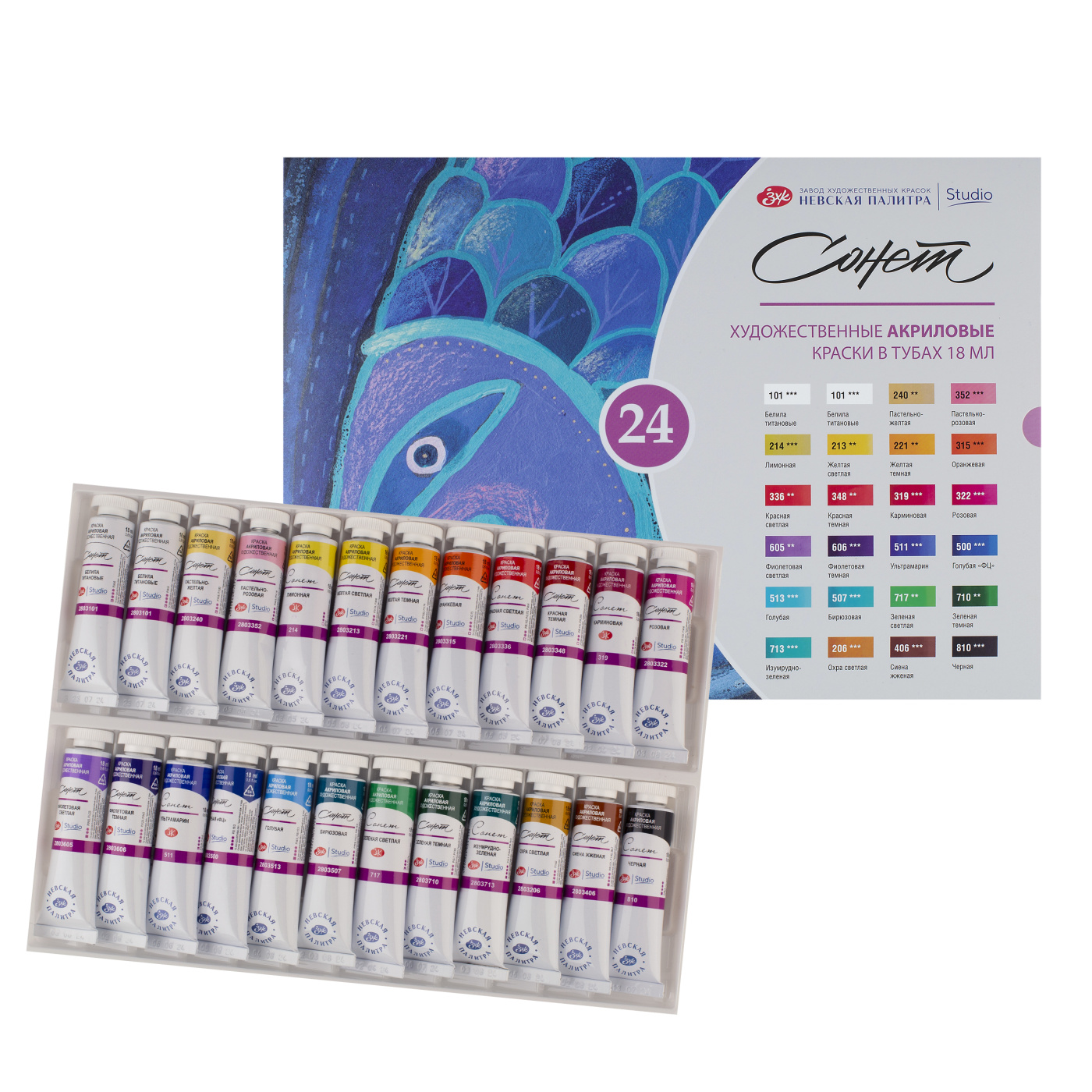 <u>Состав набора</u>: 01 Белила титановые *** - 2 тубы, 240 Пастельно-желтая **, 352 Пастельно-розовая ***, 214 Лимонная ***, 213 Желтая светлая **, 221 Желтая темная **, 315 Оранжевая ***, 336 Красная светлая **, 348 Красная темная **, 319 Карминовая ***, 322 Розовая ***, 605 Фиолетовая светлая **, 606 Фиолетовая темная ***, 511 Ультрамарин ***, 500 Голубая «ФЦ» ***, 513 Голубая *** | 507 Бирюзовая ***, 717 Зеленая светлая **, 710 Зеленая темная **, 713 Изумрудно-зеленая ***, 206 Охра светлая ***, 406 Сиена жженая ***, 810 Черная ***