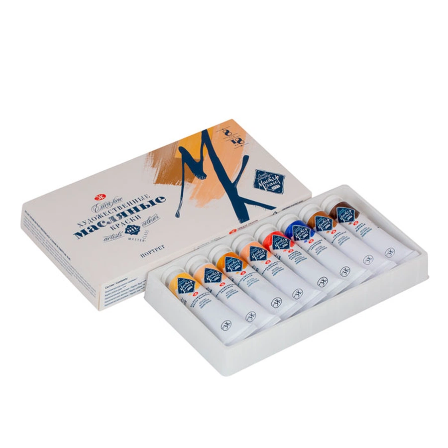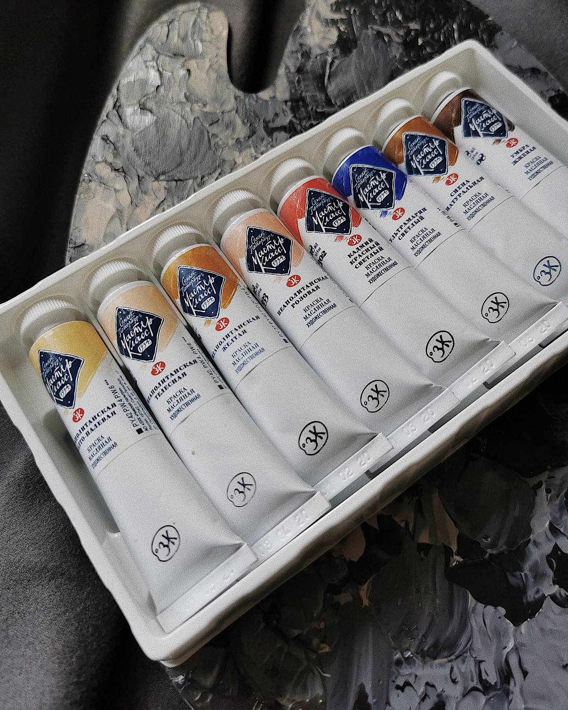 <u>Цвета в наборе</u>: неаполитанская желто-палевая, неаполитанская телесная, неаполитанская желтая, неаполитанская розовая, кадмий красный светлый, ультрамарин светлый, сиена натуральная, умбра жженая.