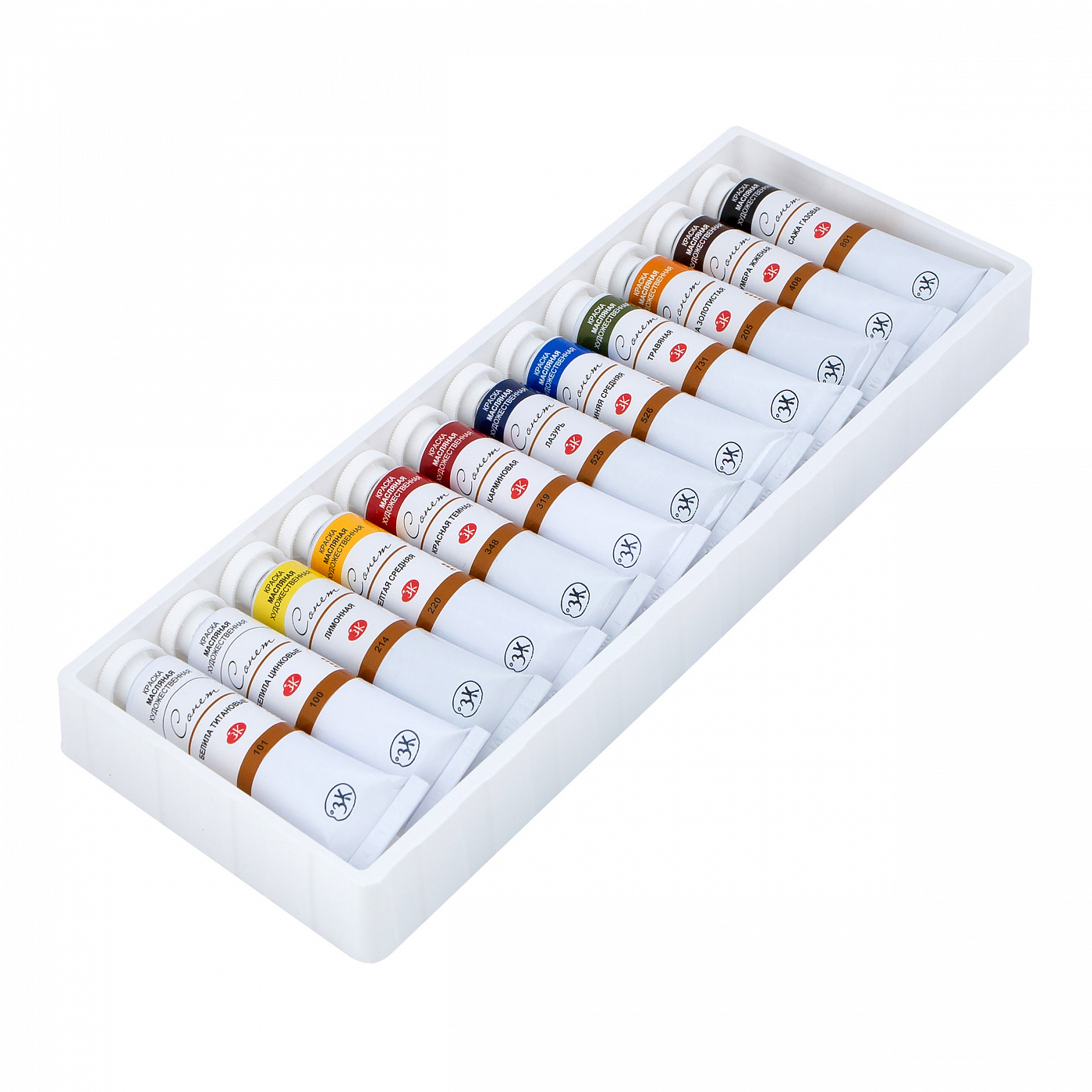 <u>Цвета в наборе</u>: белила титановые, белила цинковые, лимонная, желтая средняя, красная темная, карминовая, лазурь, синяя средняя, травяная, охра золотистая, умбра жженая, сажа газовая. <br>