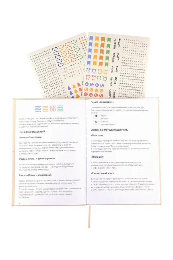 - Удобство использования: Внутренний блок в точку позволяет легко рисовать схемы, трекеры и таблицы. Нумерация страниц и лента-закладка упрощают навигацию. В комплекте также есть наклейки-маркировки для визуального выделения задач и инструкция по системе Bullet Journal, которая поможет новичкам быстро освоить метод.